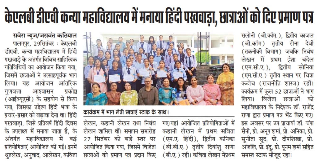 Hindi Fortnight was celebrated at KLB DAV Girls College with a variety of literary